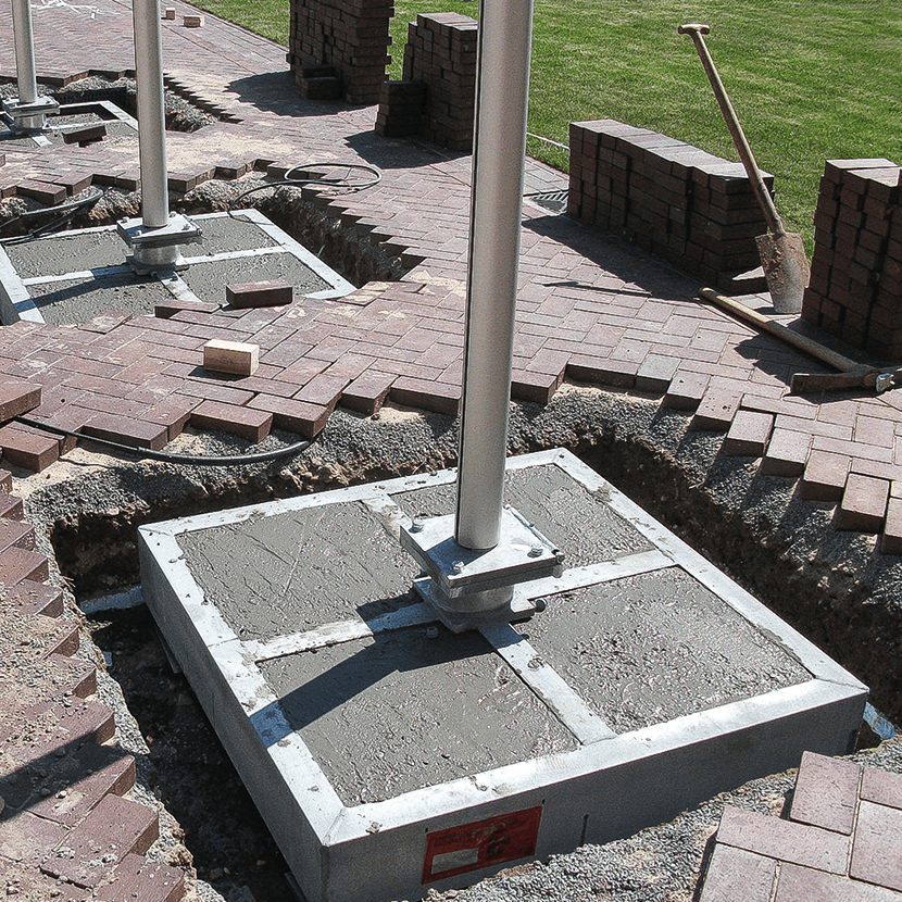 Aluminiummast und Stahlstandfuß mit Betonplatten 40 x 40 cm beschwert.